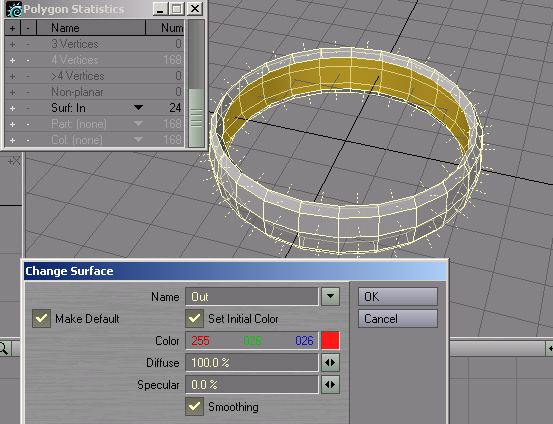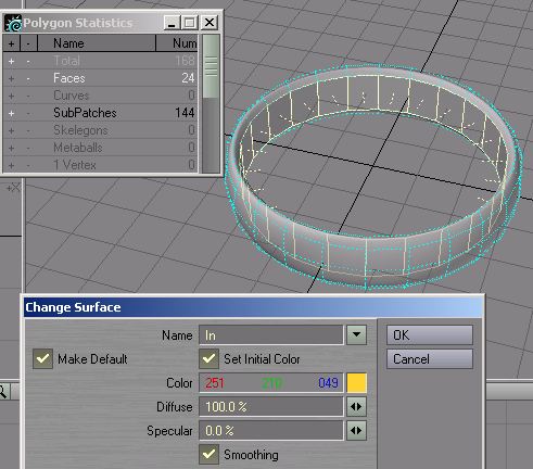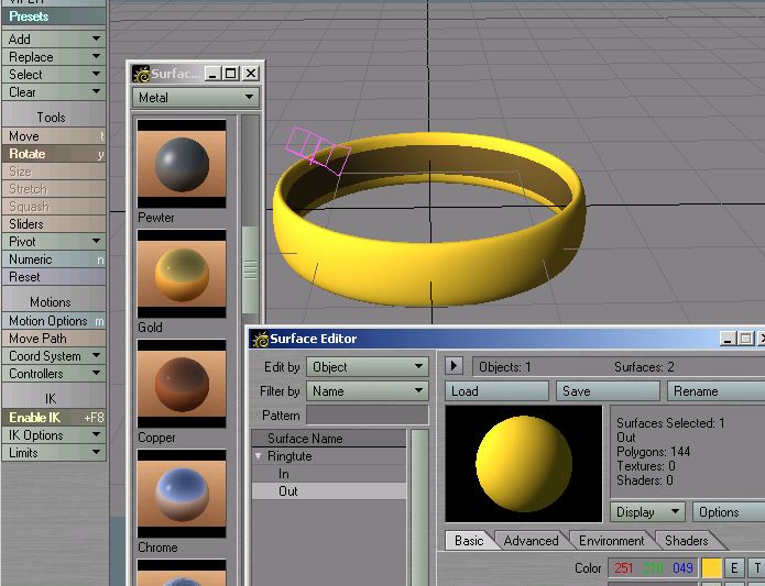 8. Next it's off to the Surface Editor. Select one of your surfaces, In or Out, and call up Presets. Go to Metal and double-click on Gold. Repeat this for the other surface, or, right-click on the finished surface and select Copy. Then go to the unfinished surface (still in the surface editor) and right-click again and, you guessed it, select Paste. Now we have a nice brown ring (yuck!)
