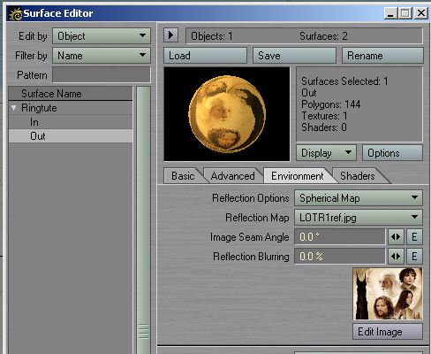 9. Still in the Surface Editor got to Environment and select Sperical Map. Then pick a reflection map. I included this one in the Ring.zip. Here's a link for others: http://lordoftherings.movies-central.com/Lordoftherings_twotowers_wallpaper.htm. You can see the one I chose, and voila, we have an interesting looking ring.