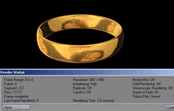 6. I colored everything the same, hit tab (changed the background of my TR viewport (d)) and here is a first look. Pleasantly One-ringlike. Save as Ringtute.lwo.