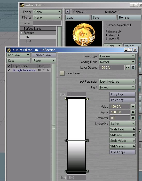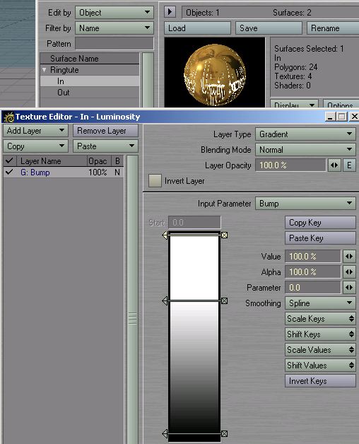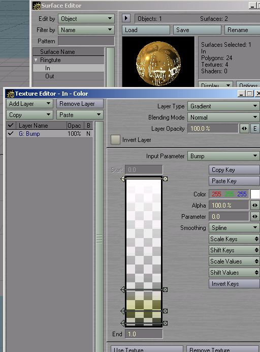 14. Alright. Now to the nitty gritty of the surface: Go to the Color Line of the surface Editor, and click on "T". Select the Layer Type "Gradient", and create a second arrow at the bottom of the gradient (Just click on the gradient field).Then go to Alpha, with that bottom arrow still selected, and change it to "0 %". I then created a third arrow to bias things toward more brightness. The bottom color will be yellow for a smoother transition between the ring metal and the writing. Then, since we want this to affect the bump (Elven Script), we select Bump as Input Parameter. And lo, the bump is white.