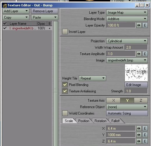 12. Download Ring.zip for the full-sized image (or recreate it yourself) . Go to the Surface Editor, and on the Bump line select "T". Then make the selections that I show below. That is, you will now load the ringwritwideN.bmp script, or a reasonable facsimile thereof. Make sure the projection is cylindrical and the texture axis is "Y". Then hit Automatic Sizing. All is well. Note: I used a Width Wrap amount of two. Your call. It doubles the script, and I like it that way.