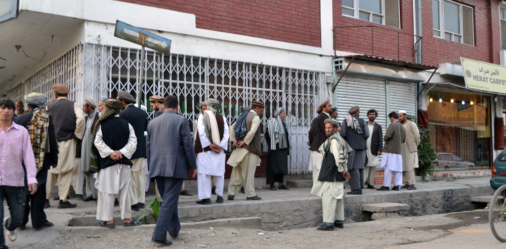 At the corner of Chicken Street, men waiting to get jobs at the city security force installation there. |