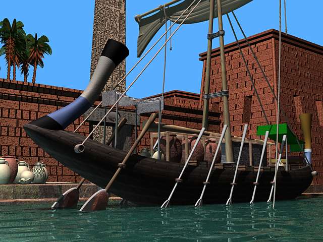 | The Egyptian ship is modeled entirely in TS3.2, after stone carvings and drawings from 2500 B.C. and older. It depicts the characteristic double mast, not often shown. One can also see why the Greeks derisively called the Egyptian ship builders "brick layers". The scarcity of the necessary lumber resulted in a relatively weak hull built from many small pieces. Not all details were available to me, so some are due to the artist's imagination. The garrison wall and the towers were built from clay bricks, a common building material in ancient Egypt. Huge stone blocks were only used for monuments. The obelisk is, as they all were, carved from a single stone slab. Steps and ramps were used to accommodate the loading and unloading of ships at seasonally varying water levels of the Nile. |