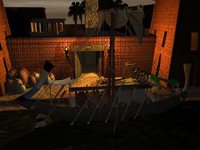 | The previous landing viewed by torch light. The chariot is modeled after one found in an Egyptian tomb, and resonably accurate. To get a little light on the ship I sent some pale moonlight across the river. Additional torches are placed on the far side of the distant wall, inside of the shrine, and inside of the right tower. Also, there is one just off to the left side of the screen. Lots of work. Neither image received any post processing. I used only TS3.2. Most of the ship and structure are textured with Tom Marlin's textures. |