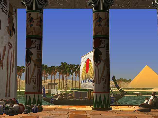 | I found some excellent drawings in a book and brought the ship in line with them. Additional touches are decorative paint on the ship's hull, a colorful collection of jugs, the now glowing pyramidion atop the large pyramid, and a green riverside with a pier, some reeds, and some sandy patches. |