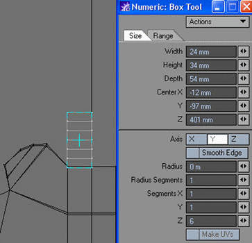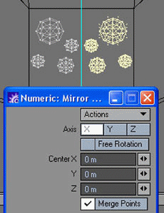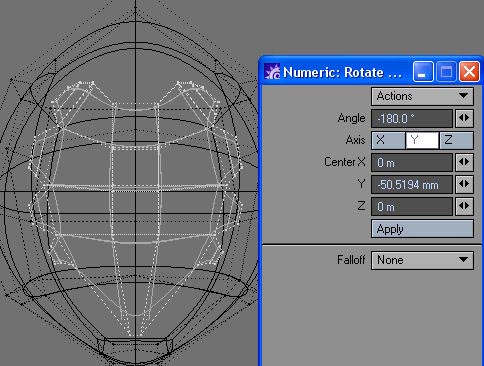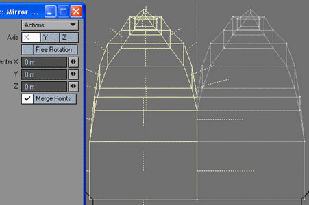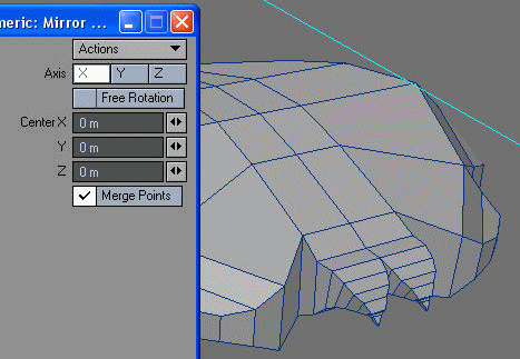 33. Now all that's left is to mirror the fang. Select it, hit < Shift-v >, and the mirror mode is entered. Hit < n > and the numeric window pops up AND the object is mirrored across the X-axis.