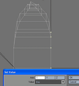 31. Hit <v> and the Set Value window opens. Since it is already at zero in every axis, hit 'ok', and the selected points, if not exactly centered in the X-axis, will be moved there.