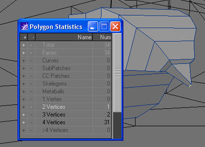 27. In the Polygon Mode (hit < Space > until the coursor looks like an 'X'), check the stats panel. If you don't see it, hit < w >. See if there are any 1 or 2-Vertices polygons shown. Select them in the panel, and they will be high-lighted (as shown). The delete them < Ctrl-x >.