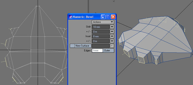 19. Bevel again, and change the values to suit. Exit bevel mode and point edit the surfaces to be more squared. Like this. Tab it and see everything round out.