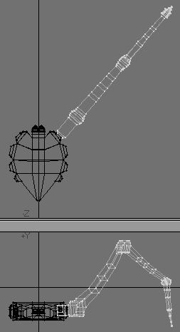 49. Now go to the layer that contain the leg, you so painstakingly beveled. Keep the forebody in the backgound layer. You can Scale < Shift-h > the leg to suit you. Next rotate and move the leg to this position. Then in the sideview, rotate < y > the whole leg down, so that the tip is below the level of the spider's belly (to raise it above the ground level.