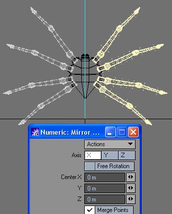 56. Mirror < Shift-v > & < n > the legs across the X-axis. You now see 8 legs, as advertise in nature's Spider Construction Manual