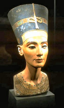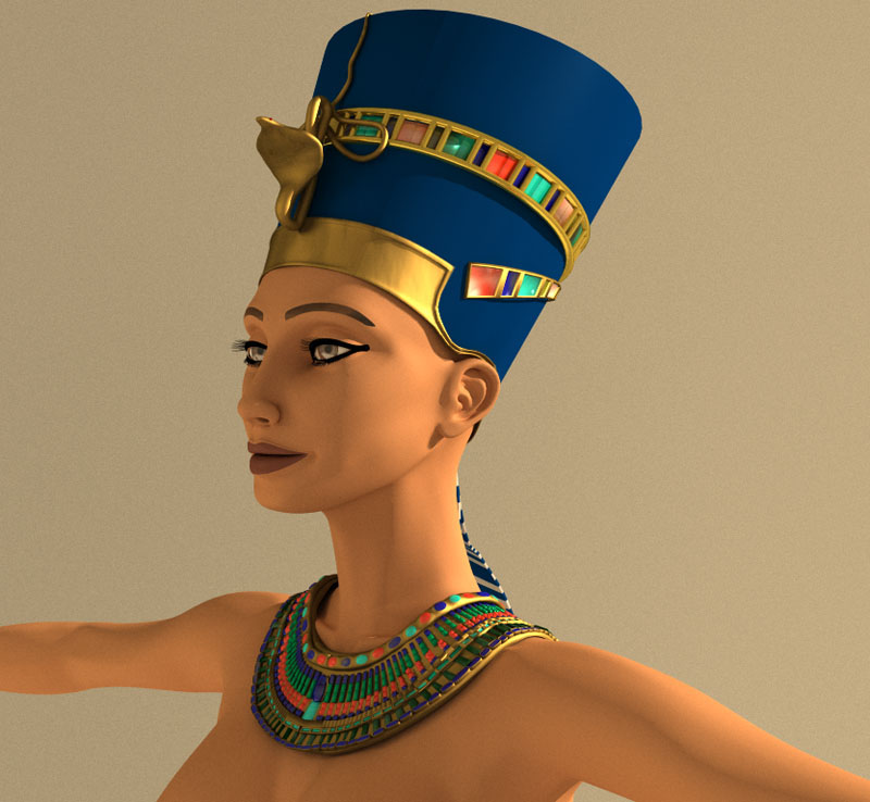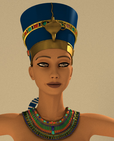 Re-rendered in f-prime radiosity, to see how a light dome would work. Finally finished the body. Still have to do tweaks here and there. Then create the texture, eyebrows, pose, add dress, and scene. The original bust is from about 1350 BC from Amarna, near modern Minya, the city she and her husband had built when they broke away from the mainstream Egyptian belief system in the many gods, that had been since ancient times, centered around the temple complex at Karnak. Skin color: she is definitely a Mid-Eastern type, and the ancient inscriptions decribe her as beautiful and "fair of skin". How fair is anybody's guess. Since she was Akhenaten's wife, I had planned to model her for some time now. I am using images of the bust, displayed in the Berlin Egyptian Museum as a reference: see Ref pic. below. |