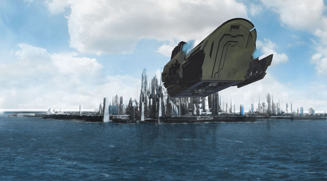 The Stargate SG1 Atlantis 'Puddle Jumper' approaching Atlantis A couple of test shots of the model. This one in front of Mirko Stödter's beautiful render of the city of Atlantis. See Mirko's amazing Wallpapers. Rendered and composited