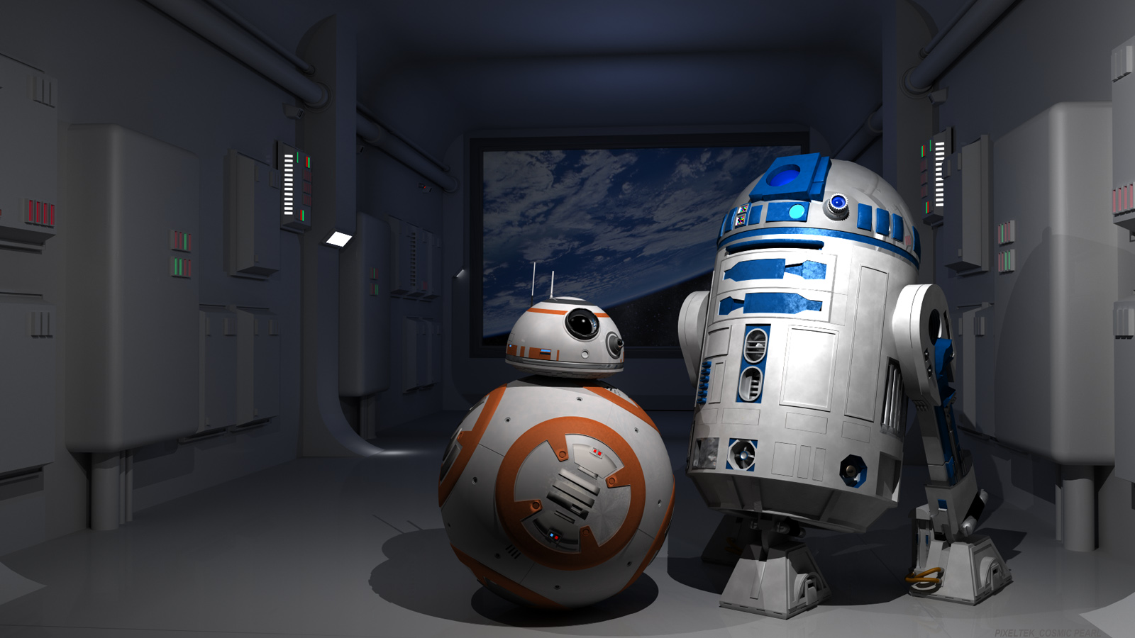 R2D2 and his young successor in the X-Wing rear seat, BB8