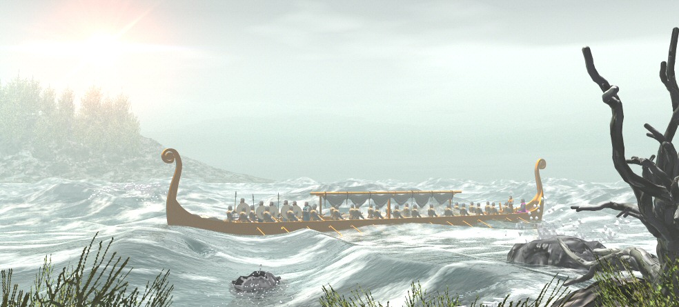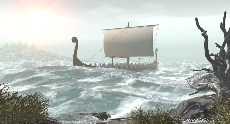 An experiment and initial learning experience. I used the Vue4 software and modified a sample scene, and then imported my LW 7.5 viking ship. I deleted rocks, added the dead tree, redid the background, increased the haze, and added a tad of fog..