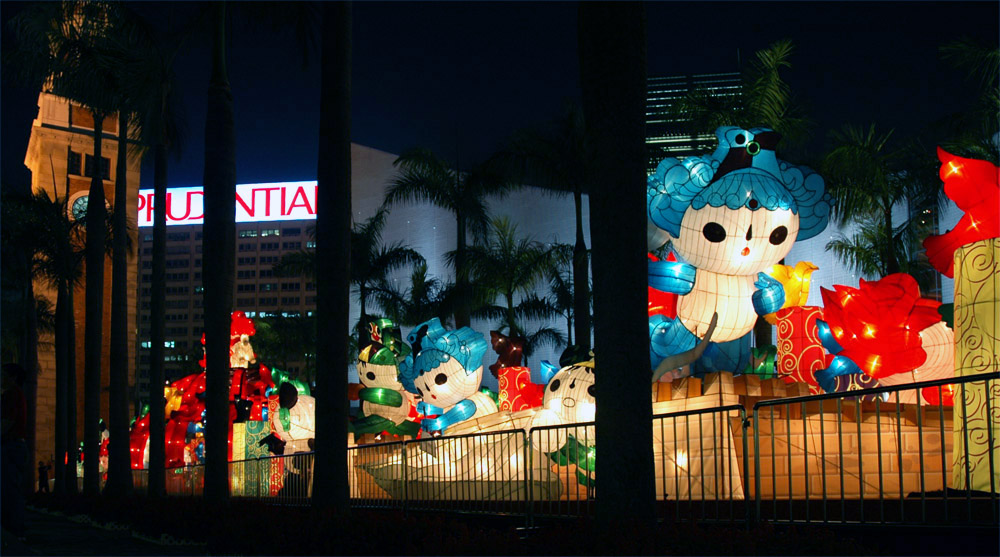 The Beijing Olympics were to happen soon and these were the inflatable and illuminated mascots |