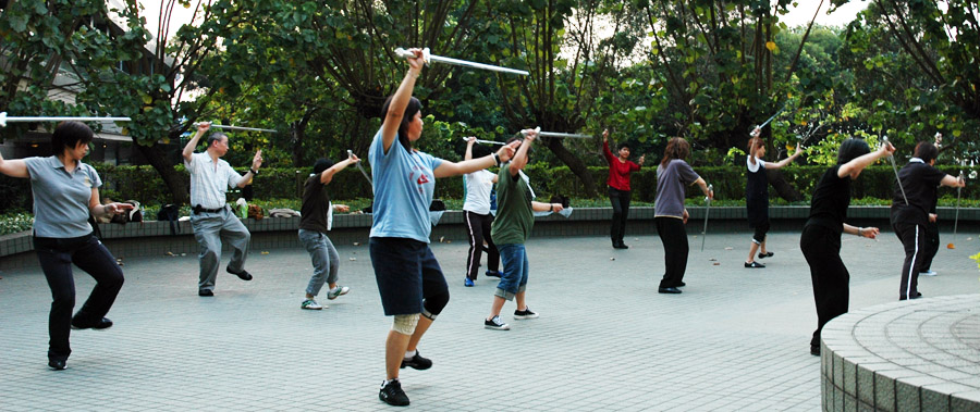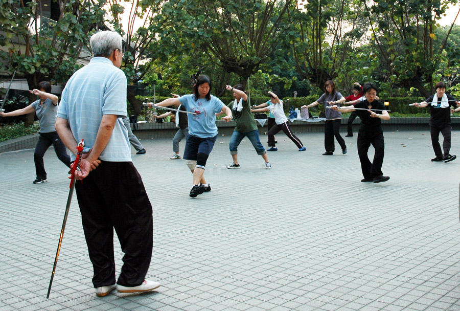 How about unwinding with a little Tai Chi with swords under the stern eye of the Tai Chi master? |