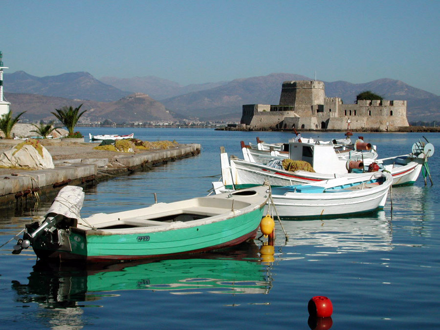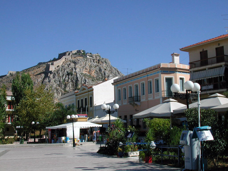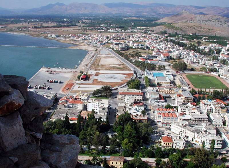 The train from Corinth into the Peloponnese at Argos Station. The train to Nafplio is visible in the background. |