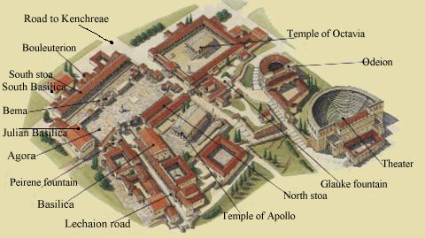 Acrocorinth, on the mountain, and Lecheaon's Road that connected the city to the harbor |