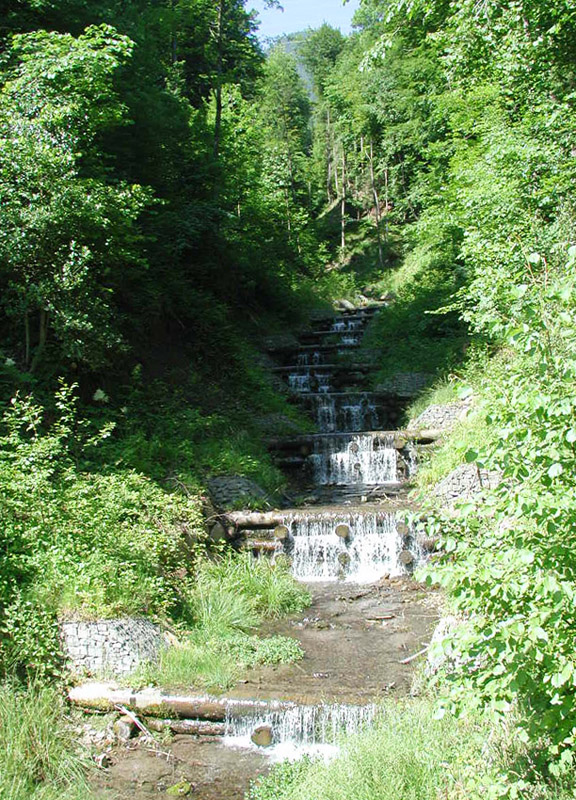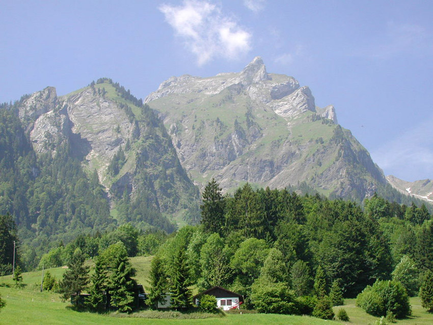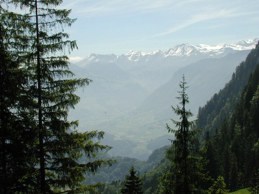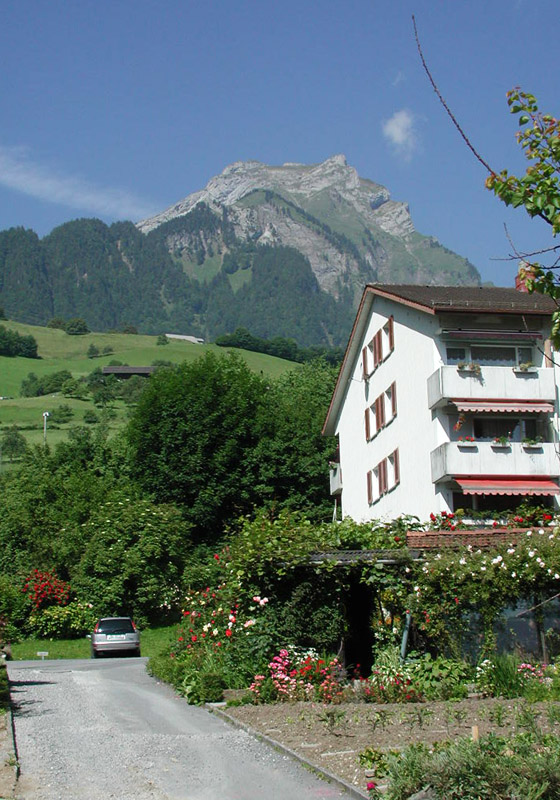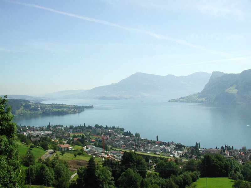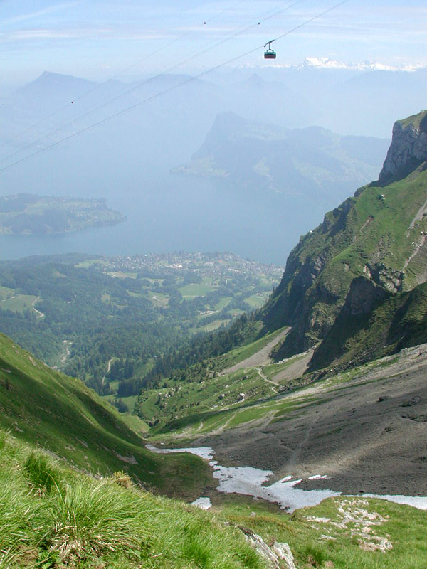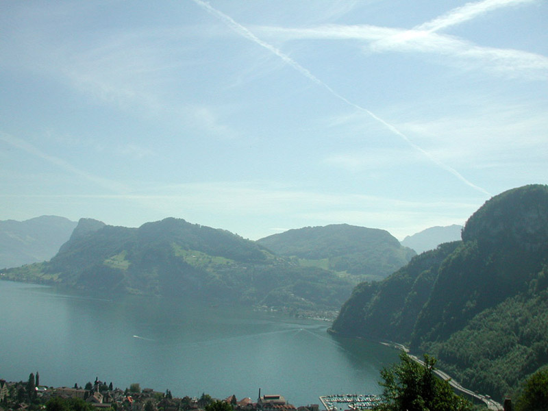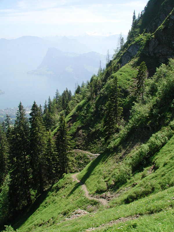 I took the train along the lake to a small town in back of which the trail up the backside of the mountain began. On the whole hike up I saw only one other person, a local, and he was coming down, carrying a paraglider (cloth wing). He decided that it was a little too windy to fly down and would try again the next day. . |