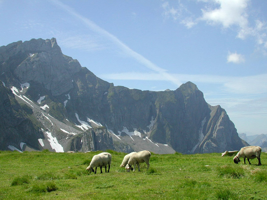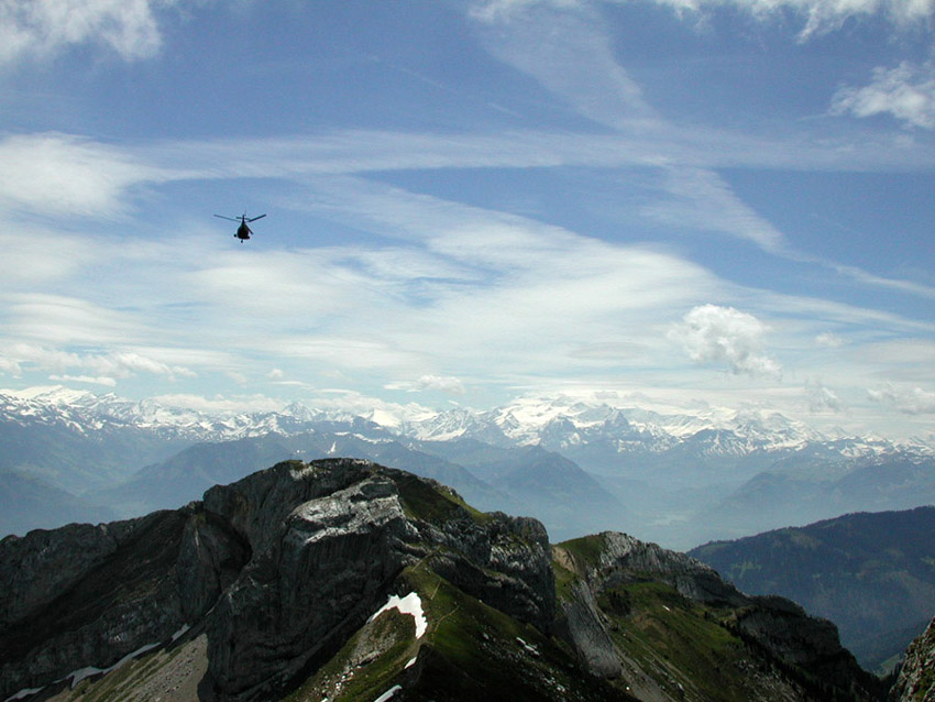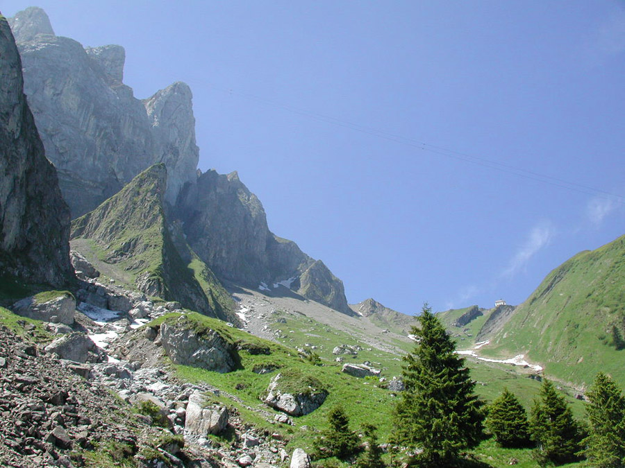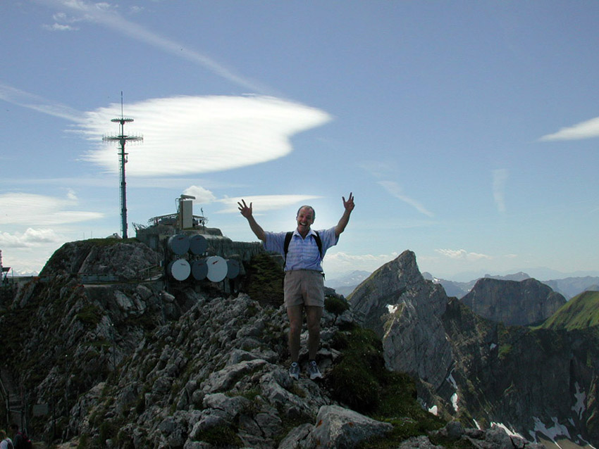 There even was a small ice field to cross. Nearly lost it there and now remember some people coming down. Actually, there was yet another way to get to the top of this mountain, other than cable car, train, or on foot. There was a way to drive up most of the mountain and there was a parking place somewhere beyong that little chapel you can see in the distance. |