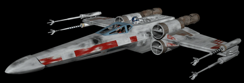 8. Repeat that expansion process in the side view. Again, with the backdrop image as a guide. This leaves us with artifacts from the extension process such as this. You don't want all those extra polygons and should select them and delete them. All we want is the outside, i.e. the X-Wing skin. Much simpler that way.