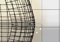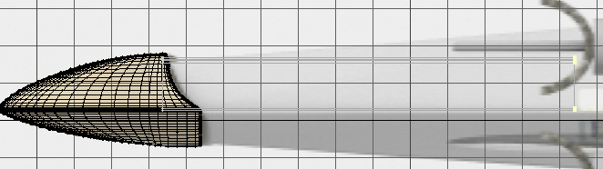 7. In the top view, (I rotated this picture by 90 degrees) hit 'h', and arrage the square cursor on the centerline. Then with the Ctrl key depressed, widen the cross-section to conform with the general outline of the background image. I use 'h' to get an even expansion between the points, rather than the more 'painful' points editing.