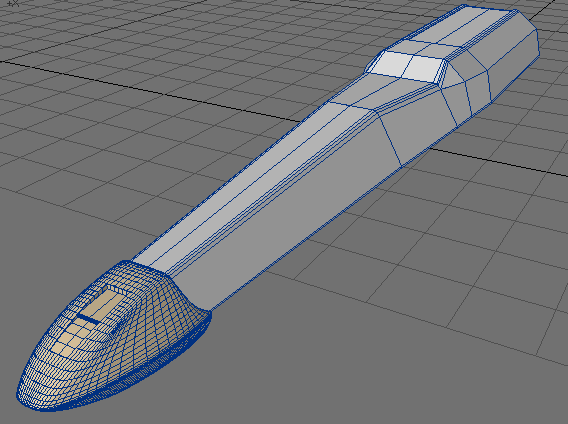 17. All the way at the end of the fuselage, select the points, hit 'e' and extend them a bit, as you see here, and after the extension, use 'Shift-h' to pull the edge slightly inward. Make sure the cursor is placed in the center of the fuselage, as seen from the back.