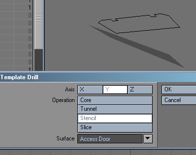 18. Swap layers ( ' ) and go to CONSTRUCT > Drill, select the 'Access Door' as Surface, and then in the Y-axis, (the direction along which we project the door outline) select 'Stencil' and hit OK.