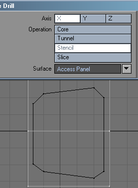 31. Now the stencil is in the background and the two polygons are in the foreground. Go to CONSTRUCT Tab, select Drill, Stencil, and the surface to be stenciled = Access Panel. Then think of the projection/stencil direction. It's across the fuselage polygons, meaning you have to use the X-axis. Hit 'OK' and the access panel surface now is etched onto the copy of the fuselage polygons.