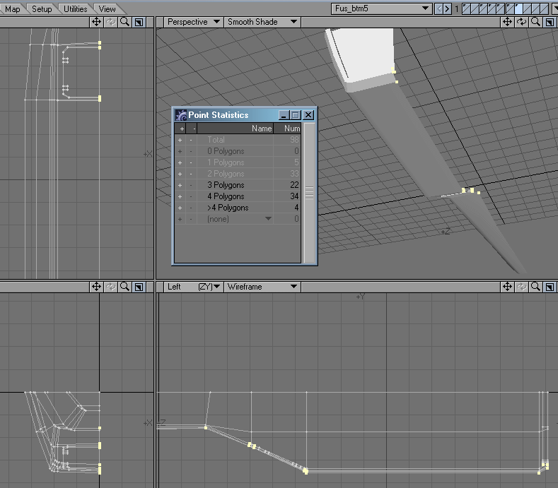 22. At this point, I'd like you to go back for some additional work on the UPPER fuselage. They are, after all, parts of one thing. Eyeballing the top, looking at reference photos, grab these points and widen the upper deck slightly. Next, use Point Editing to get the side straight.