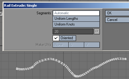 29. The next steps serve to give the wire bundle (or pipe, as it may be) some volume. Go to a vacant layer and create the cross-section of whatever you want to build. In this case, I will create a small disk and place it precisely at the starting end of the curve polygon. Center the disk in ever viewpoint possible and even tilt it, as I did here, to adjust to the initial slope of the curve in every axis necessary. Then, with the curve in the background, go to MULTIPLY and Rail Extrude. Make sure the Oriented box is checked. Hit Ok and there it is, a wire bundle.