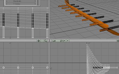 14. Simply, in the polygon edit mode, select all of the offensive polygons, (best done in the lower-right viewport - head-on view) and make sure you get the circilar end polygons too. Like this, and then hit <x>, and they'll be banished into cyberspace - unless you hit the <u> key. Then you can get them back, should your dark little heart desire that.
