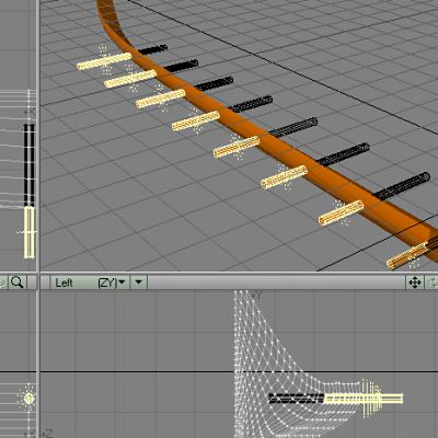 15. At last, here is the hull segment, oar holes, stress areas and all. Save your file as ship_tute6.lwo What happened to file 5? I used it as the before Boolean and file 6 as the after Boolean operation. Anyway, the Boolean object is in layer six of the zip file. Have fun. Render the result and see what you think. Maybe it's nothing, but at this time I am not pleased. Hang tight, however, in Part 3 we'll take care of this.