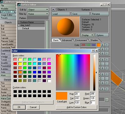 3. You say, "Wait! I did not! Where's that color come from?" Ok, here's how: Go to the Surface Editor, select Default, and click on the little color square to bring the palette up. There click on any color you like, as long as it looks like mine :-). No really, it's your choice. Make sure you check "Smoothing" in the Basic tab page.