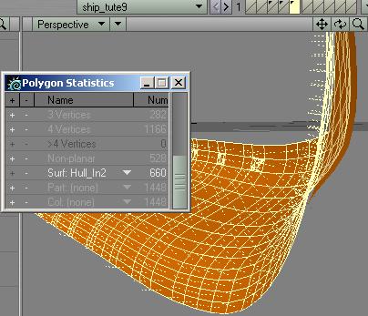 27. Now for the deck. Go to layer 5. You'll have to back-paddle a bit here, for convenience. Go to the Polygon Stat window and slide down to Surf: none. Click and hold on the down-facing triangle and select surface Hull_In2. Copy and paste it to layer 6.