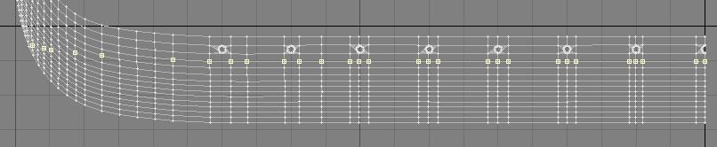 21. Now to a real pain in the butt. In the combined layer 5, select every point as I show in the illustration. As you probably noticed already, I neglected to pick the intermediate points that appear in two of the edge segments for a reason. Firstly, I have no intention to affix the oar-port liners to the hull, to not cause new stress areas. Secondly, I intend to only create half of each liner and then mirror it. Now, that's just a suggestion. Read on and you may decide to rather connect all of the points with polygons, one at a tine. That way no final adjustment of the mirrored portion is necessary. Your call.