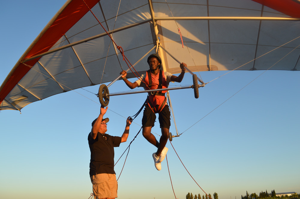 If we had not been tethered, none of us, I am certain, would have remained aloft very long and left the platform moving at 17-22mph with not a very happy ending. What this system allowed us to do was to learn the flying characteristics of the wing and become familiar with it. |