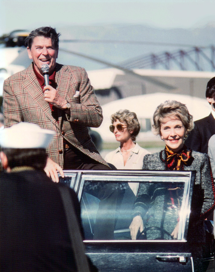 President Ronald Reagan and Mrs. Nancy Reagan When going through a box of pictures, I ran across this one. I knew I had it, and there should be negatives of a few more of them, although this was the best of the bunch. This was in the '80s, of course, on one of the occasions when the President would go to his Santa Barbara ranch and AF-1 would land at NAS Point Mugu, Oxnard, CA, where I worked. Usually, he would just come in and then the string of limos would come and go, or, as in this case, it was Marine One. This time he stopped to give a brief speech, thanked us at the Pacific Missile Test Center for our service, and then he headed out. He was among his own, and very relaxed, as you can tell from where I was standing. There was just one Navy photographer in front of me, between me and the First Couple. At the time I was in airborne weapons test and evaluation and part of the F/A-18/AIM-120 AMRAAM integration program and also a 'weekend warrior', being P-3 aircrew with VP-65, the Tridents, just across the field. Those were the days, for me as well as for the country.