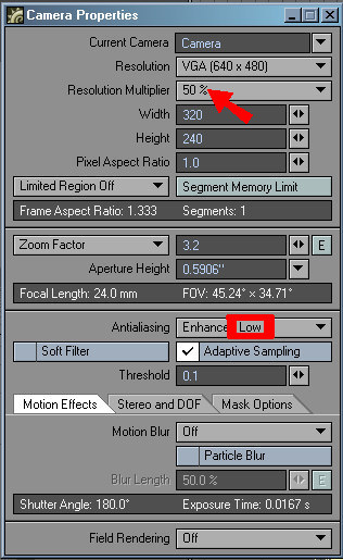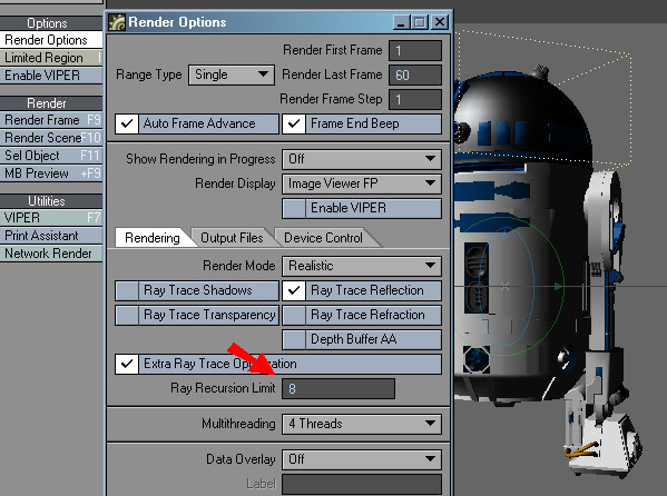 | 11. Now to render this baby. a) In the left upper corner select 'Window" and set your background color (default is black) b) Under the Render Tab, select Render Options and this is what I chose: |