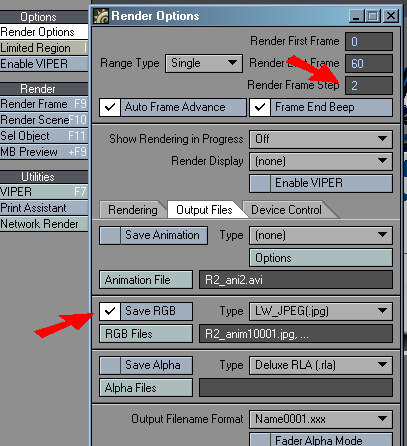 | c) Under the Output Files tab in Render Options, select "Save RGB" the choose LW JPEG and a name e. g. R2_Anim. LW may pick the numbering scheme (you can change it). |