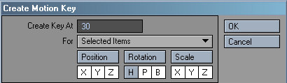 | 6. With the slider in the Frame zero position, enter 45 degrees next to the H, or simply drag the red arrow in the top-down view to where you want the head to go to (notice, I used 45 deg). 7.Now click on 'Create Key' and the Create Motion Key window pops up. Click on the (Rotation) 'H' and then 'ok'. 8. Move the slider to frame position 15. 9. Enter 0.00 degrees and the head will go back to center. Click on 'Create Key' and the Create Key window pops up again. The H will be already high-lighted, so just click on 'ok'. The window will show a 15 in the top field. Here is the table for all of the frame positions: