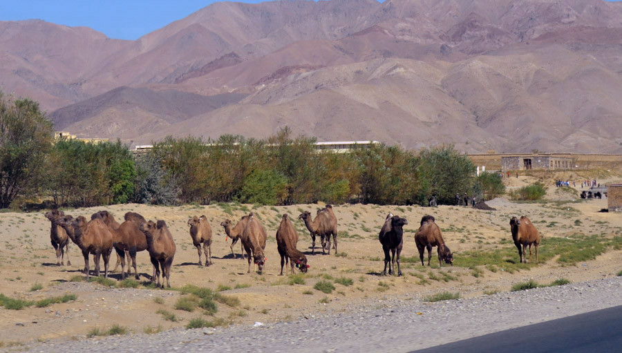 | Nomads, to the annoyance of Afghan drivers, let their camels graze free along the highway. Not all of them are smart (probably goes for both) and occasionally one gets hit, when crossing the road, frequently resulting in the death of both. |
