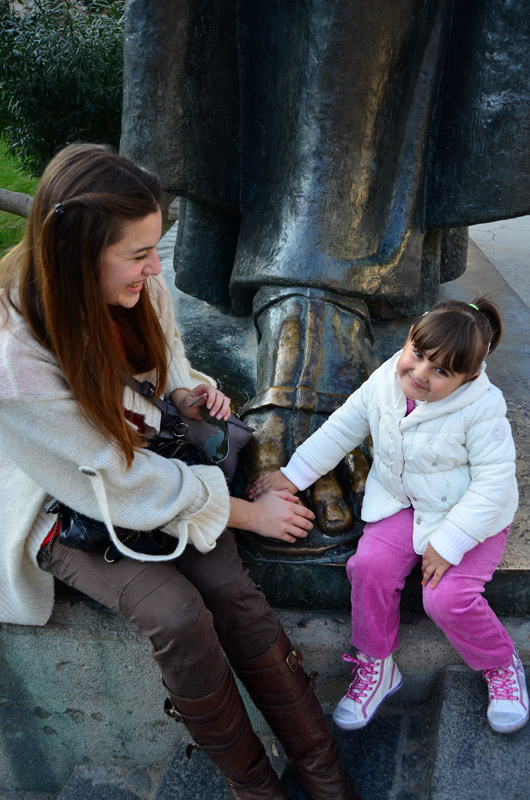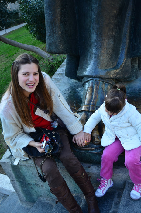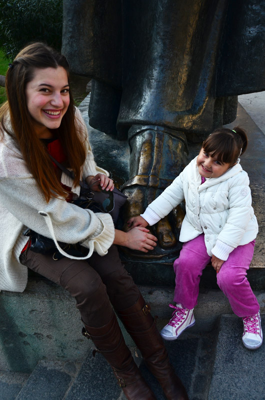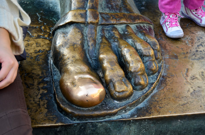 I saw the statue with the toe gleaming and then went to look at an old Roman gate. When I came back, these two were at the foot of the statue.