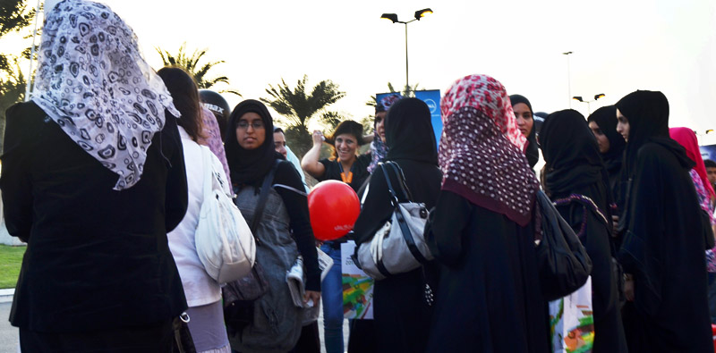Waiting for the shuttle bus, but being Muslim, out here, back in the real world, it's women and men separated again |