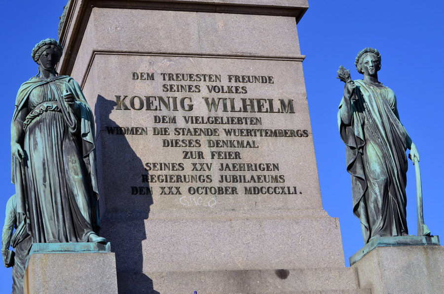 | The inscription reads: To the most trusted friend of his people, the beloved King Wilhelm, the citizens of Wuertemberg (the province or state, if you will) dedicate this monument to celebrate the 25th anniversary of his rule, 30 October 1841. |