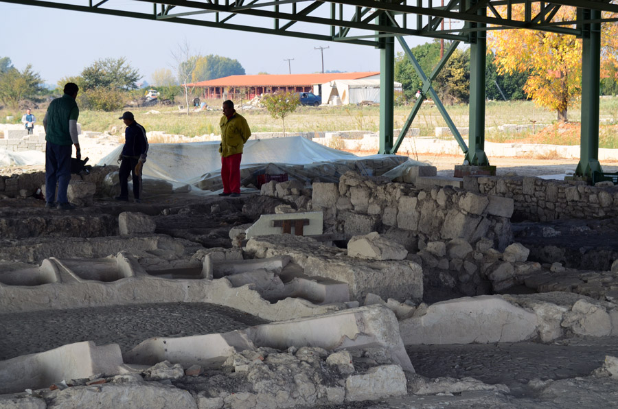 An hour or a little more, by bus, took me to the fields of Pella. The ancient capital of the Macedonian Empire and now a tiny farm community in Northern Greece. When visiting here, you'll want to go to the mosaiks and field digs first, and the ticket you buy there will also give you access to the Museum. Go early, the museum closes early. |