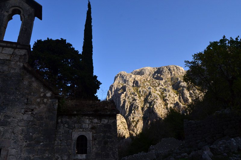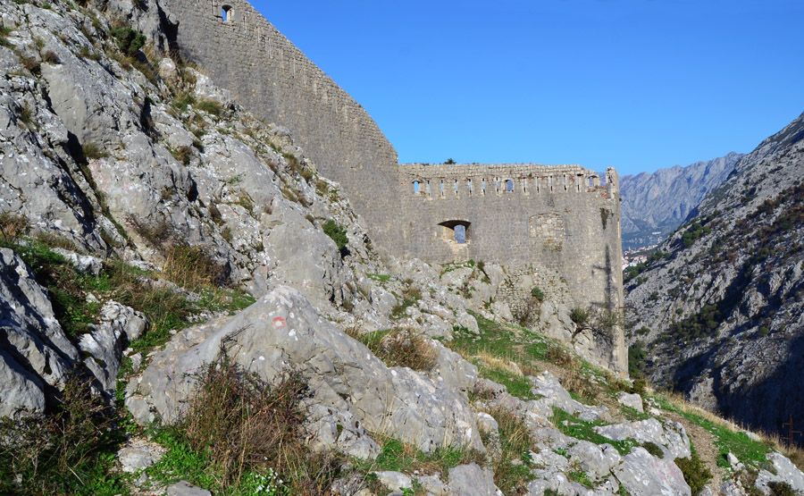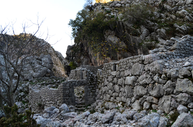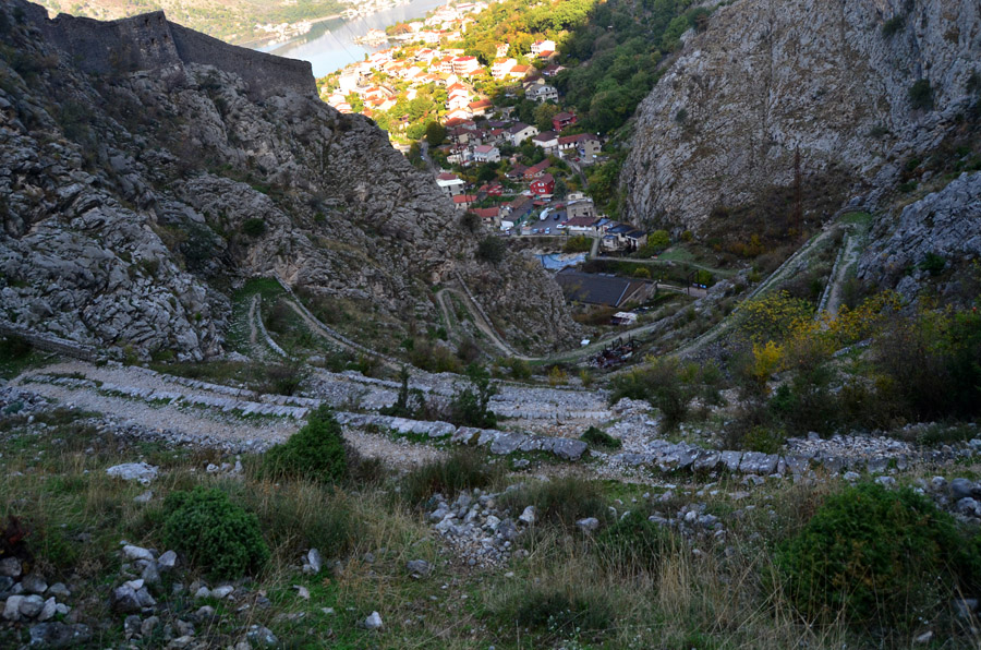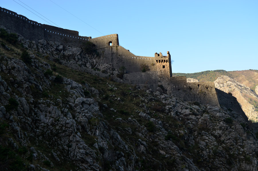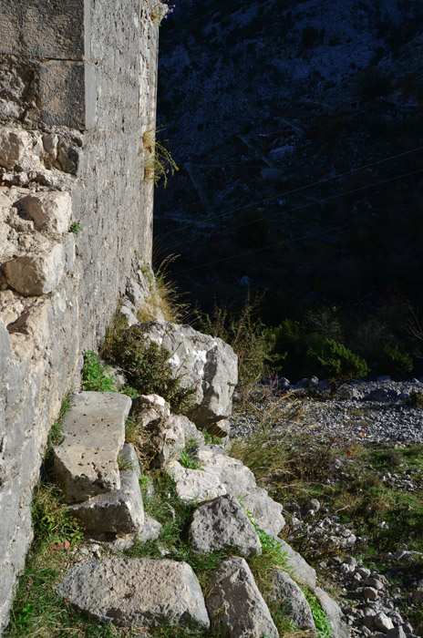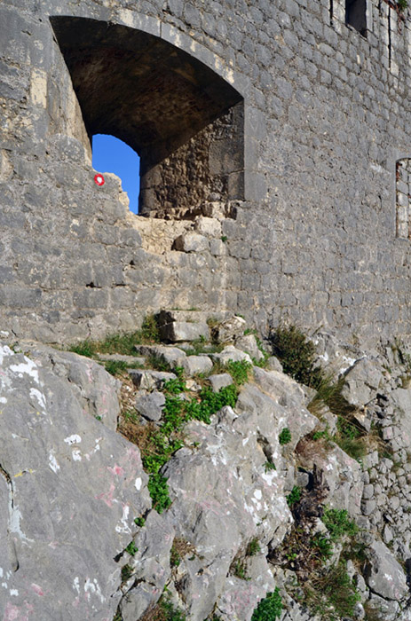 Early in the morning, then, I decided it's time to hustle up the mountain to the fortress. The problem is that I did not follow recommendations by several locals. Mainly, because I saw, in my meandering around the area, a backdoor path leading up to the castle that would not be clobbered with tourists. But wait! I'm off season. True, I forgot. So up I went and the only thing I saw was animal droppings and a farm, once I got up there to a fork in the road. Still, it was a legitimate hiking path, except that to get into the castle, you have to perform a special little task, as you will see. |