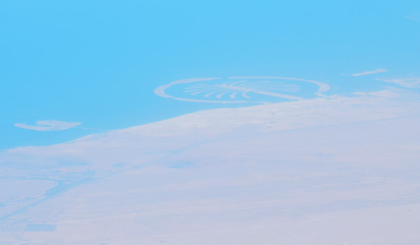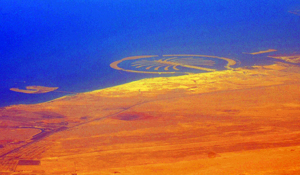 When I was flying out of Muscat on Qatar Air (great and brand-new airline), I was staying by the window (I had a row to myself) trying to see UAE coast, looking for those palm-shaped oceanside condo developments. I did see one, although barely, because of the altitude and haze, but it was clearly one of them. I think there are three, total. I used false color to enhance it for easier viewing. |