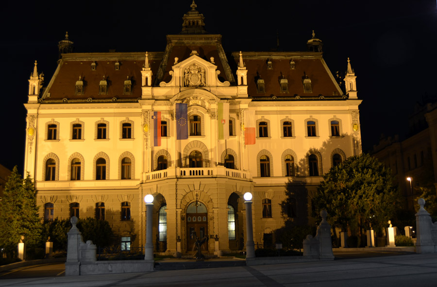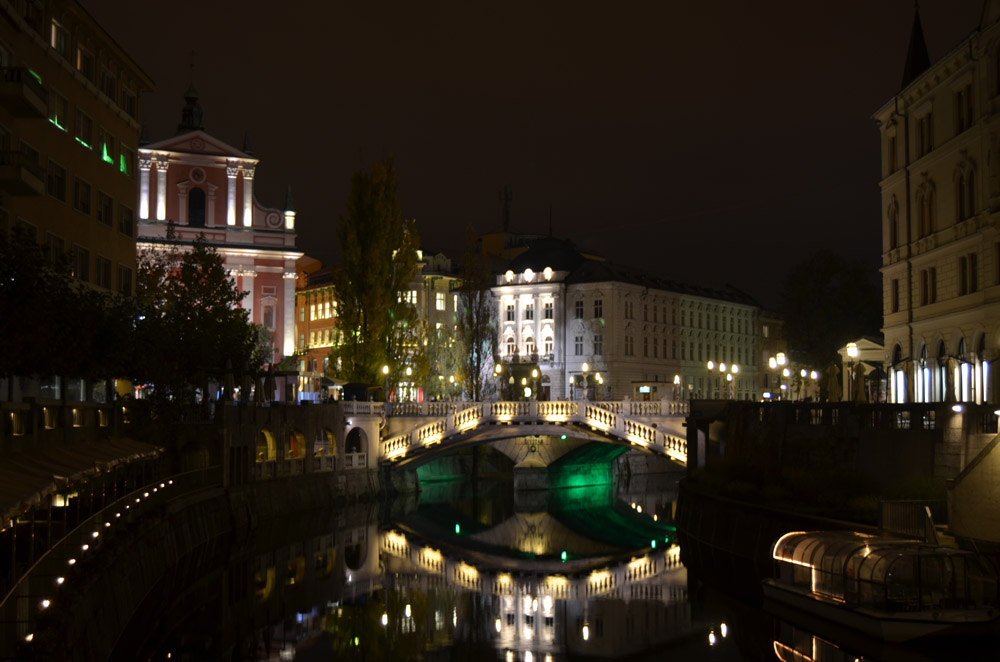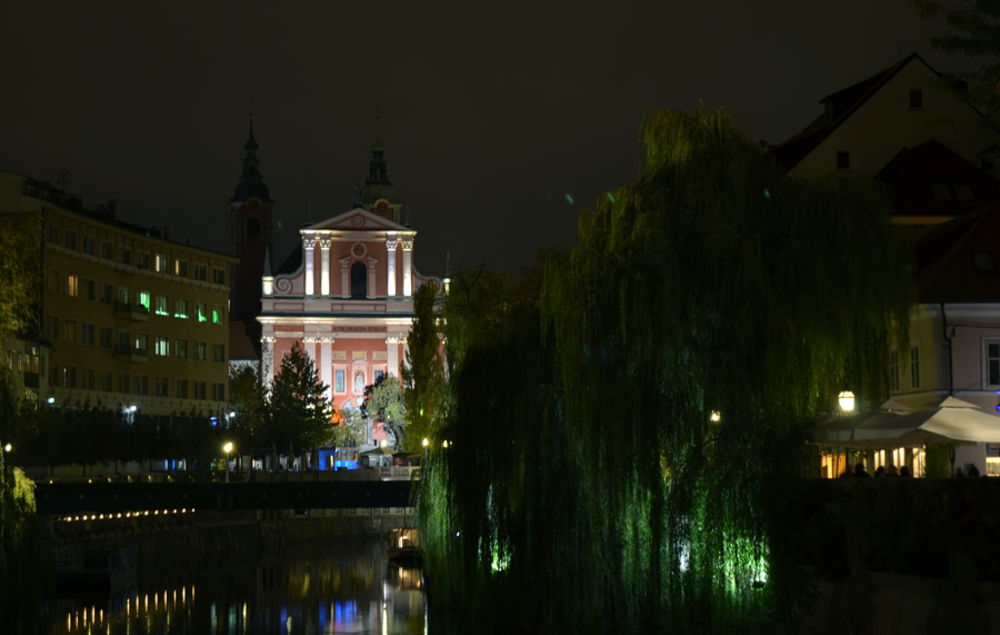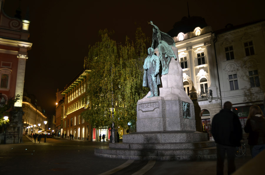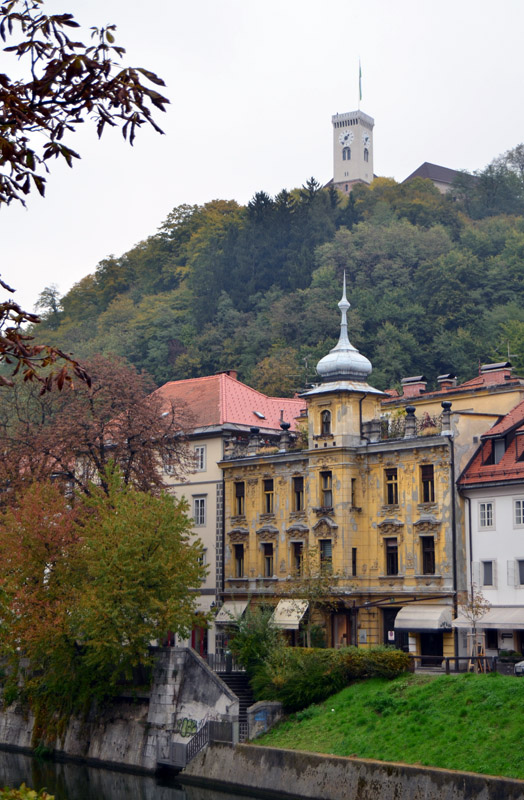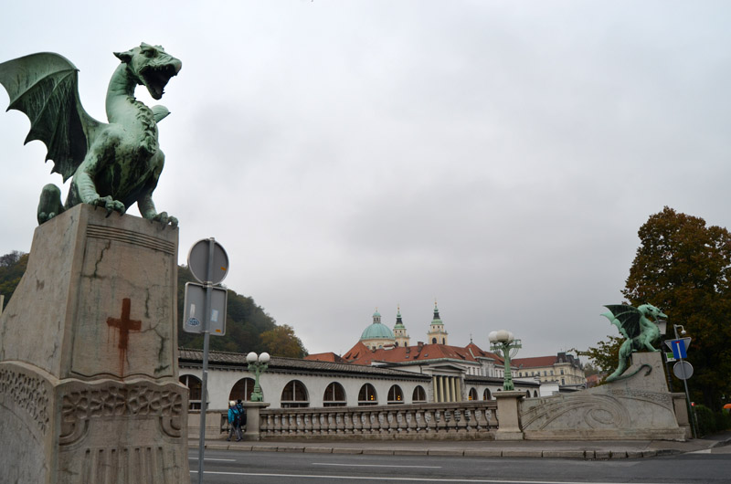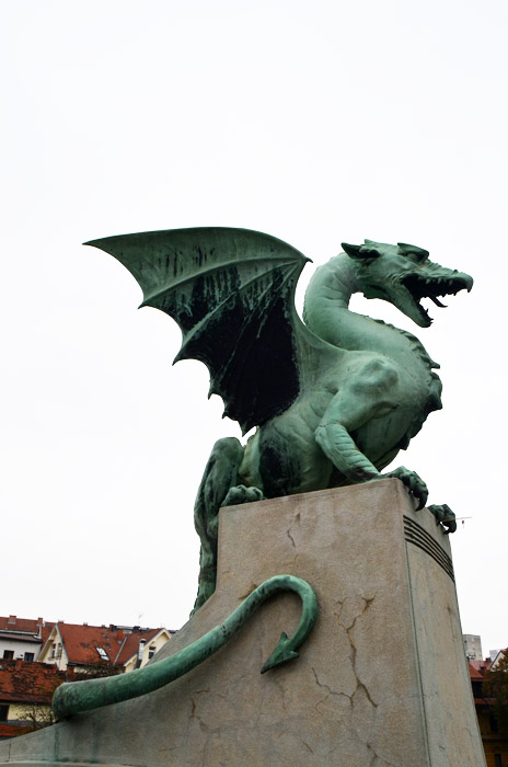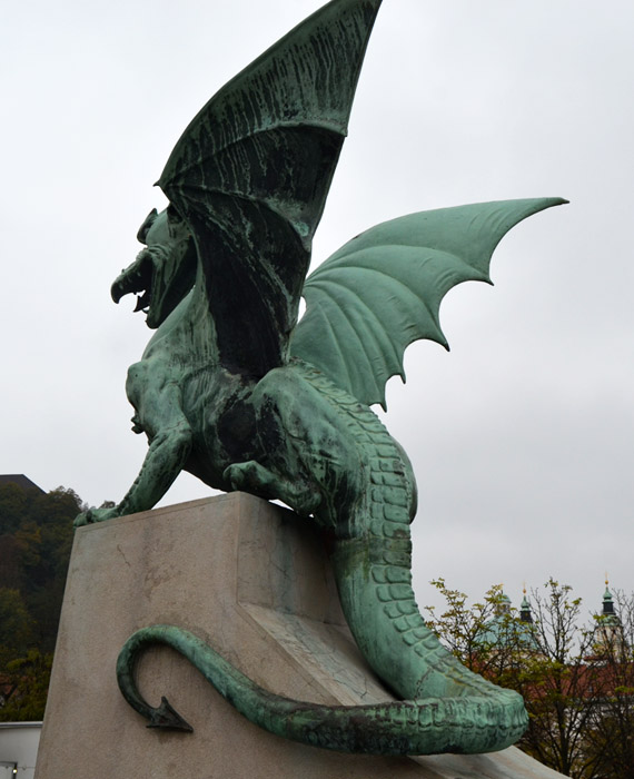 | Dragon Bridge. Almost missed it, thinking that it was in the next town, Zagreb. I got to the train station with 2 hours to spare and drifted into the tourist information office. Right there, on the wall was a picture of a dragon and it was here in Ljubljana. I stuffed my large backpack into a storage place, way in back, because I had no more Euros and left it unlocked. Then raced back into town. First in the wrong direction, the one I had not explored yet. There, I was told in broken English that I need to turn back. It was just beyond the last bridge I had looked at the day before. So close. |